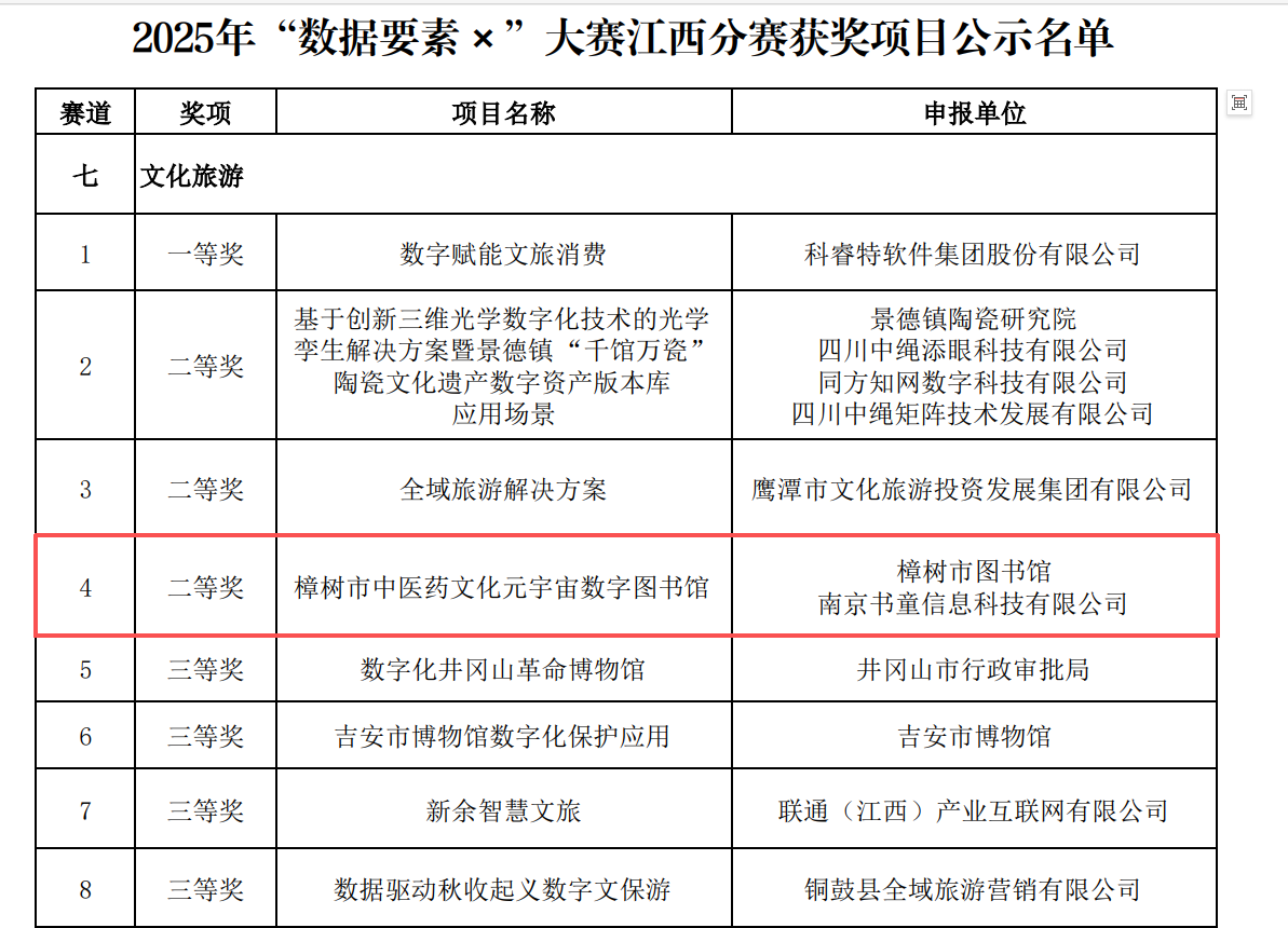 近日,2025年“數據要素×”大賽江西分賽獲獎名單正式公布。樟樹市圖書館申報的“樟樹市中醫藥文化元宇宙數字圖書館”項目,在競爭激烈、亮點紛呈的文旅賽道中脫穎而出,榮獲省級二等獎。