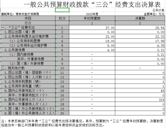 市醫療保障局2020年度一般公共預算財政撥款“三公”經費支出年初預算數為27萬元,決算數為25.54萬元,完成預算的94.6%,決算數較2019年增加18.78萬元,增長277.8%,其中: