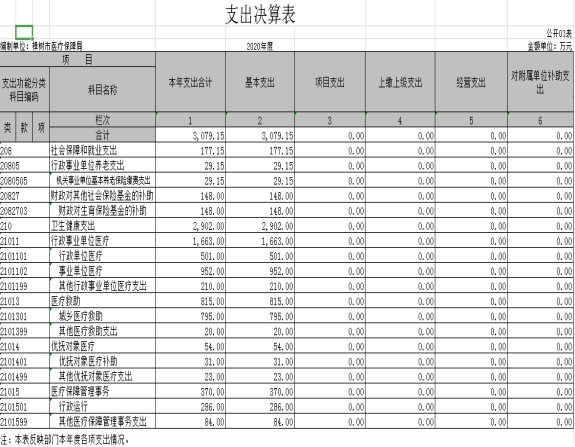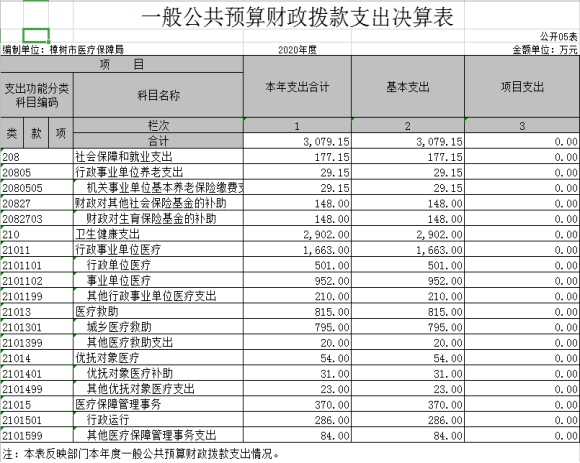 市醫療保障局2020年度財政撥款本年支出年初預算數為600.38萬元,決算數為3079.15萬元,完成年初預算的100%以上。其中: