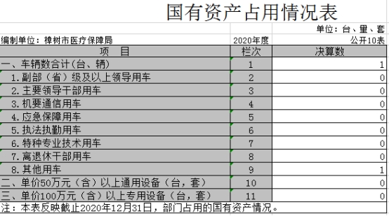 截止2020年12月31日,市醫療保障局國有資產占用情況見公開10表《國有資產占用情況表》。其中車輛中的其他用車主要是保留一輛公務用車用于對定點機構進行醫保基金監管稽查用。