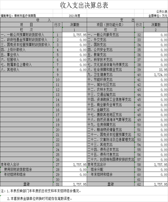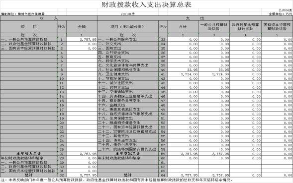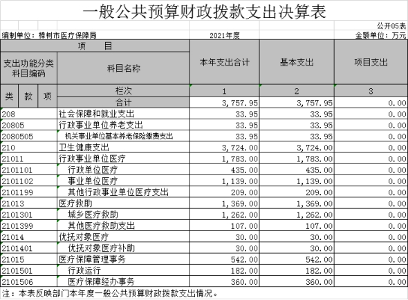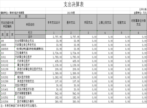 本部門2021年度財政撥款本年支出年初預算數為607.05萬元(不含財政對基本醫療保險基金的補助),決算數為3757.95萬元,完成年初預算的100%。其中: