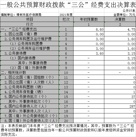 三、“三公”經費:指用一般公共預算財政撥款安排的因公出國(境)費、公務用車購置及運行維護費和公務接待費。其中,因公出國(境)費反映單位公務出國(境)的國際旅費、國外城市間交通費、住宿費、伙食費、培訓費、公雜費等支出;公務用車購置及運行維護費反映單位公務用車車輛購置支出(含車輛購置稅、牌照費),按規定保留的公務用車燃料費、維修費、過橋過路費、保險費、安全獎勵費用等支出;公務接待費反映單位按規定開支的各類公務接待(含外賓接待)支出。