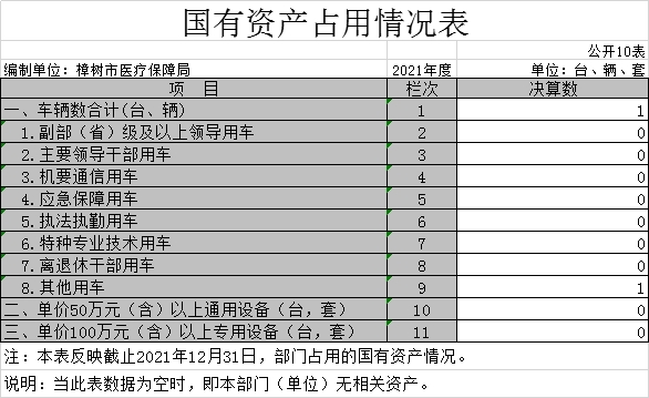 截止2021年12月31日,本部門(單位)國有資產占用情況見公開10表《國有資產占用情況表》。其中車輛中的其他用車主要是保留一輛公務用車用于對定點醫療機構進行醫保基金監管稽查使用。