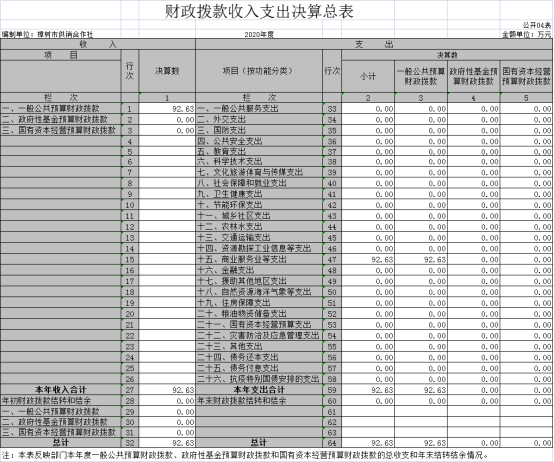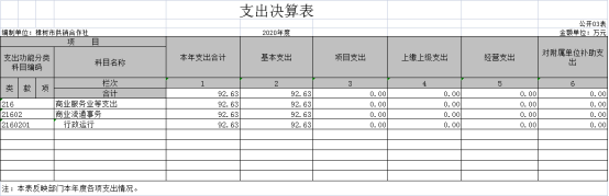 本部門2020年度財政撥款本年支出年初預(yù)算數(shù)為92.63萬元,決算數(shù)為92.63萬元,完成年初預(yù)算的100%。其中:商業(yè)服務(wù)業(yè)行政運行支出年初預(yù)算數(shù)為92.63萬元,決算數(shù)為92.63萬元,完成年初預(yù)算的100%。