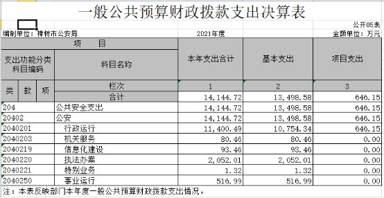 十三、公共安全支出(類)公安(款)行政運(yùn)行(項(xiàng)):指公安局的基本支出,主要用于在職人員的工資保險(xiǎn)等。