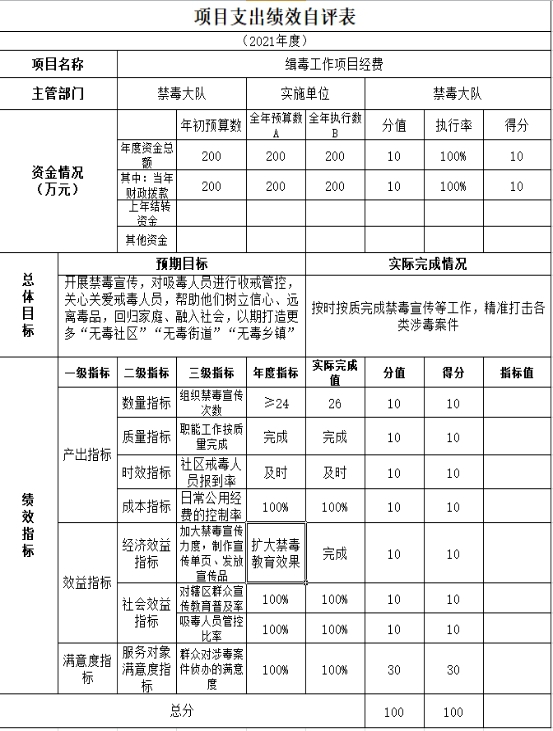 經(jīng)綜合考評(píng),2021年緝毒工作經(jīng)費(fèi)專項(xiàng)資金績效評(píng)價(jià)組評(píng)價(jià)為100分,總體績效評(píng)價(jià)為:優(yōu)秀。