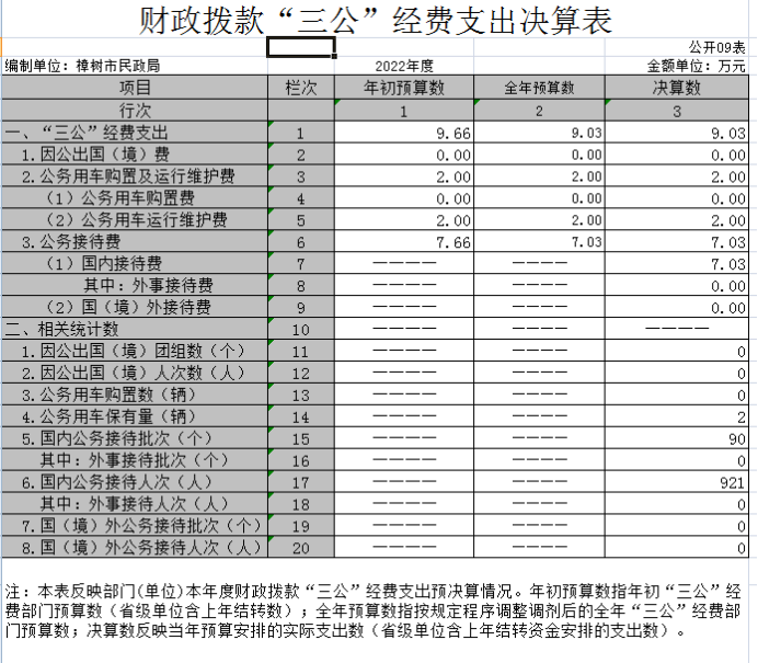 (三)公務用車購置及運行維護費支出2萬元,其中公務用車購置年初預算數為 0萬元,決算數為0萬元,完成預算的0 %,決算數較2021年增加0萬元,增長0%。決算數較年初預算數增加的主要原因是:無相關支出;公務用車運行維護費支出年初預算數為2 萬元,決算數為2萬元,完成預算的100 %,決算數較2021年增加0萬元,增長0 %。決算數較年初預算數增加的主要原因是:無相關支出。2022年公務購車0輛,保有量為2輛,與國有資產占用情況11輛有差距。主要原因是:實行公務用車改革后,樟樹市殯葬服務所無公車,保留了9輛殯葬業務專用車。