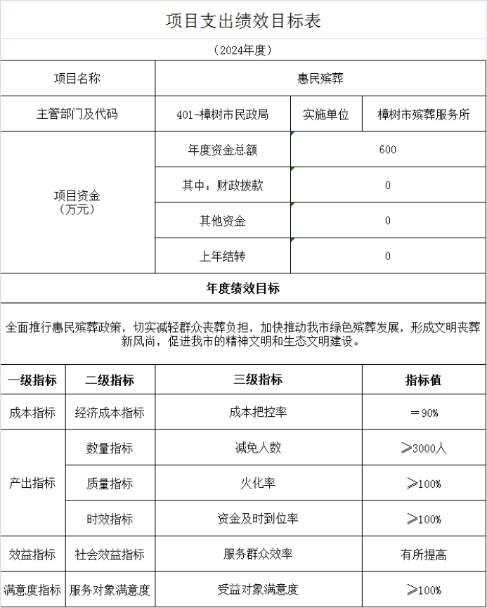 6)年度預算安排:年度預算安排惠民殯葬減免項目經(jīng)費600萬元。