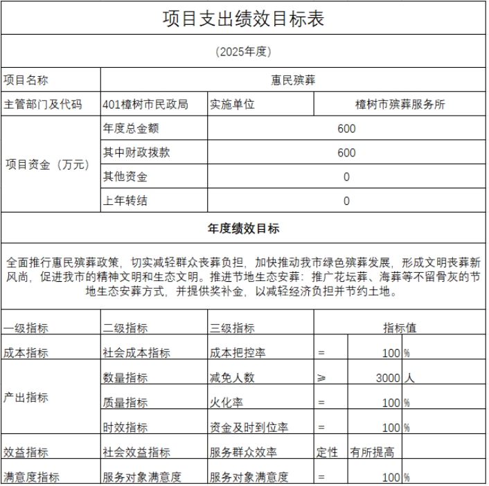 6)年度預算安排:年度預算安排惠民殯葬減免項目經費600萬元。