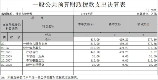 本部門2021年度支出總計817.09萬元,其中本年支出合計817.09萬元,較2020年增加176.12萬元,增長27.47%;主要原因是:發放第七次人口普查“兩員”經費;年末結轉和結余0萬元,較2020年增加0萬元,增長0%。