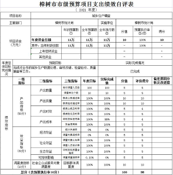 根據預算績效管理要求,我部門組織對納入2021年度部門預算范圍的二級項目10個全面開展績效自評,共涉及資金 56.2萬元,占項目支出總額的100%。組織對“城鄉住戶調查”、“縣級糧食產量抽樣調查”等10個項目開展了部門評價,涉及一般公共預算支出21萬元,政府性基金預算支出0萬元,國有資本預算支出0萬元。