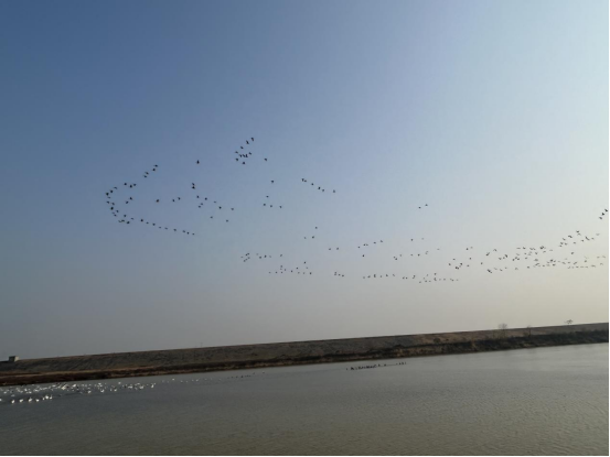 在寬闊的河面上劃出道道波紋。成群結隊的候鳥交替飛起與降落,鳥鳴聲此起彼伏,宛如一幅美麗靈動的生態畫卷。