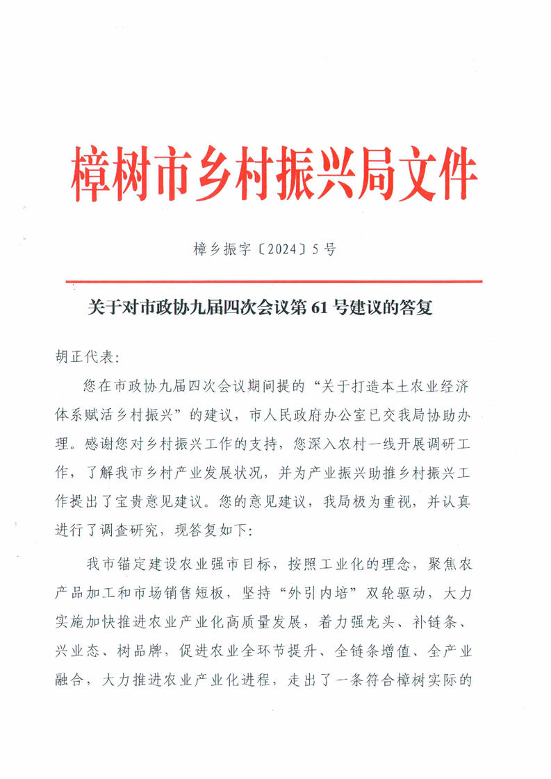 樟鄉(xiāng)振字〔2024〕5號關(guān)于第九屆政協(xié)代表第四次會議代表關(guān)于打造本土農(nóng)業(yè)經(jīng)濟體系賦活鄉(xiāng)村振興的建議回復(fù)