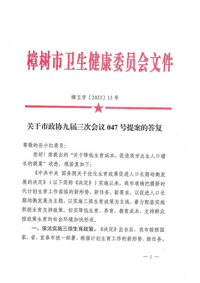 樟樹市衛健委關于市政協九屆三次會議047號提案的答復