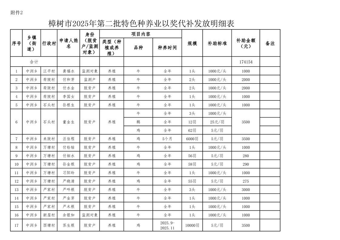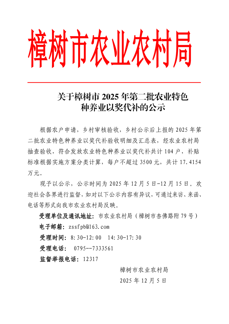 關于樟樹市2025年第二批農業特色種養業以獎代補的公示