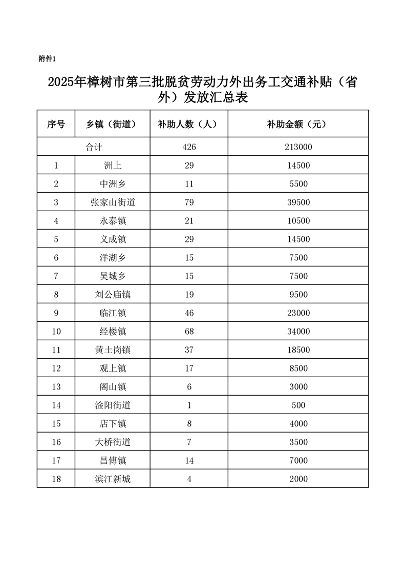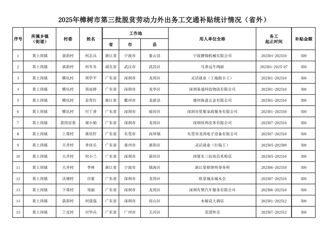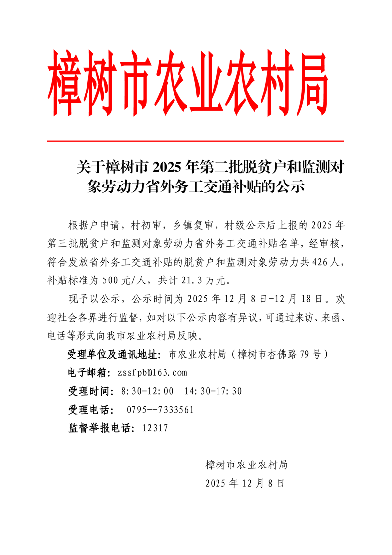 關于樟樹市2025年第三批脫貧戶和監測對象勞動力省外務工交通補貼的公示