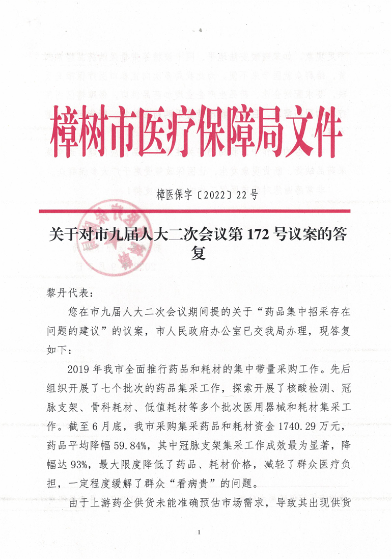 樟樹市醫(yī)療保障局關(guān)于對(duì)市九屆人大二次會(huì)議第172號(hào)議案的答復(fù)