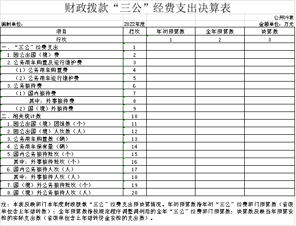 “三公”經費支出:指用財政撥款安排的因公出國(境)費、公務用車購置及運行維護費和公務接待費。其中,因公出國(境)費反映單位公務出國(境)的國際旅費、國外城市間交通費、住宿費、伙食費、培訓費、公雜費等支出;公務用車購置及運行維護費反映單位公務用車車輛購置支出(含車輛購置稅、牌照費),按規定保留的公務用車燃料費、維修費、過橋過路費、保險費、安全獎勵費用等支出;公務接待費反映單位按規定開支的各類公務接待(含外賓接待)支出。