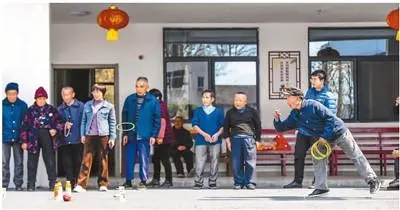 江西省樟樹市店下鎮(zhèn)養(yǎng)老服務(wù)中心的老人在戶外玩游戲。 周 亮攝(人民視覺)