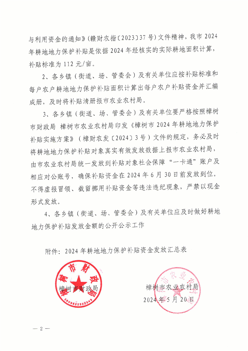 樟財農發〔2024〕4號關于發放2024年耕地地力保護補貼資金的通知