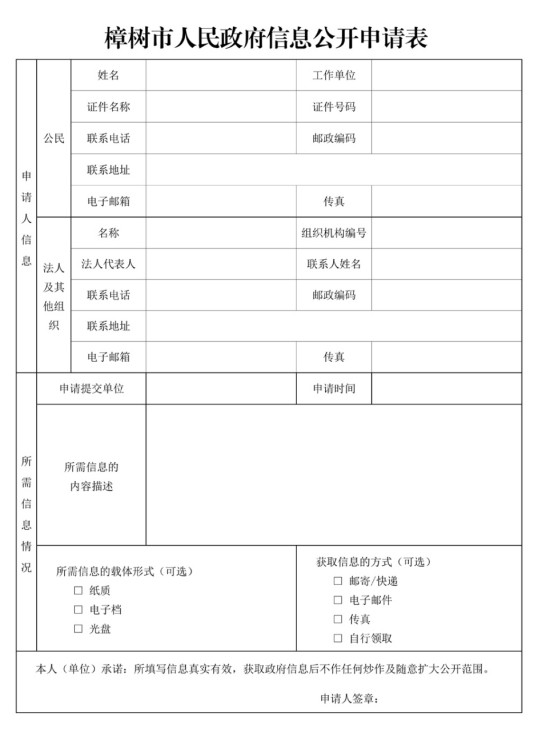 申請人填寫《政府信息公開申請表》(以下簡稱《申請表》),申請表可以在樟樹市政府門戶網站政務公開頁面下載,申請表復印有效。