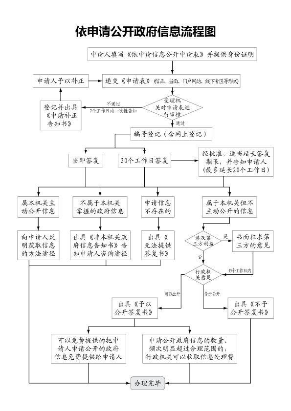 本機關收到政府信息公開申請后,按規定程序對申請進行審查,能夠當場答復的,當場予以答復;不能當場答復的,自收到申請之日起在20個工作日內予以答復;如遇特殊情況需延長答復期限的,經本機關信息公開工作機構負責人同意,并告知申請人,可延長20個工作日。