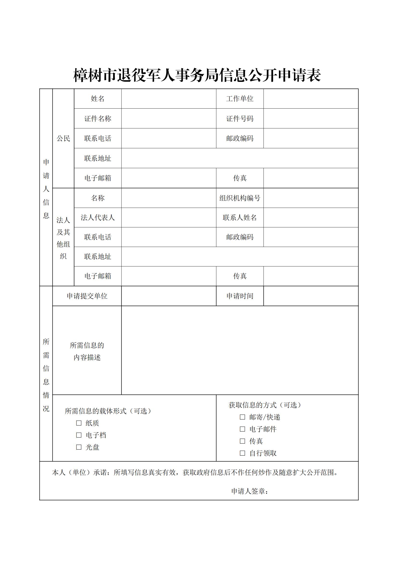 向本機關提出申請的,填寫《樟樹市退役軍人事務局信息公開申請表》(樣表附后,以下簡稱《申請表》)。申請表復制有效,可以在本機關領取,也可以在本機關網站下載電子版。為了提高處理申請的效率,申請人對所需信息的描述請盡量詳細、明確;若有可能,請提供該信息的標題、發布時間、文號或者其他有助于本機關確定信息載體的提示。