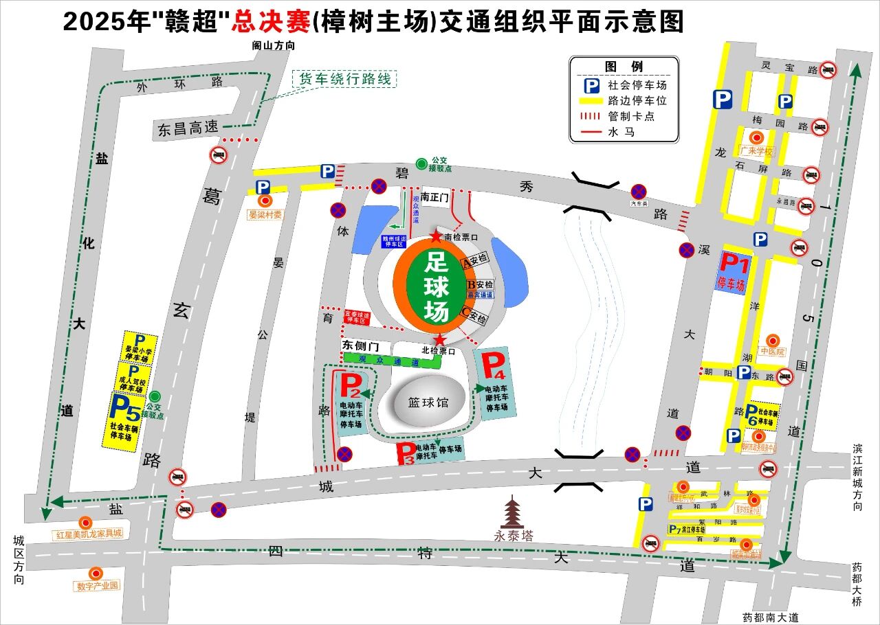 2025年“贛超”總決賽(樟樹主場)將在我市體育館開賽。賽事期間,預計市體育館周邊車流、人流量劇增,建議大家合理安排出行時間,盡量選擇綠色出行。為確保觀賽秩序,保障“贛超”的順利進行,溫馨提示如下: