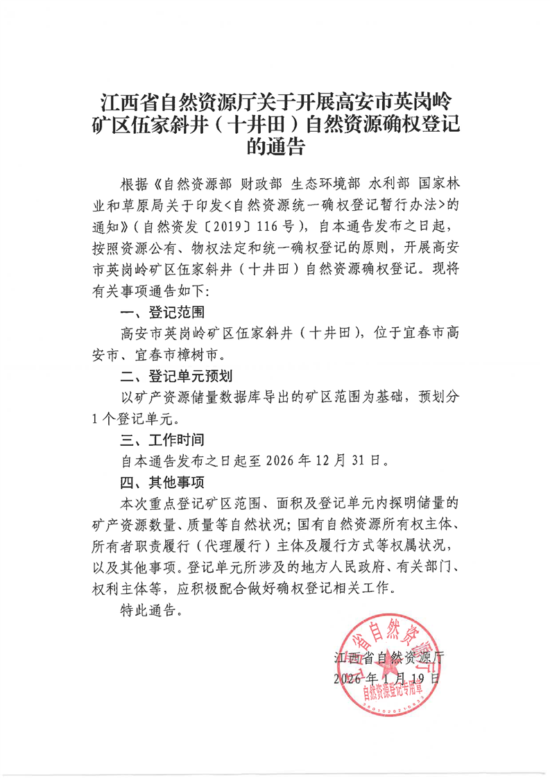 江西省自然資源廳關(guān)于開展高安市英崗嶺礦區(qū)伍家斜井(十井田)自然資源確權(quán)登記的通告
