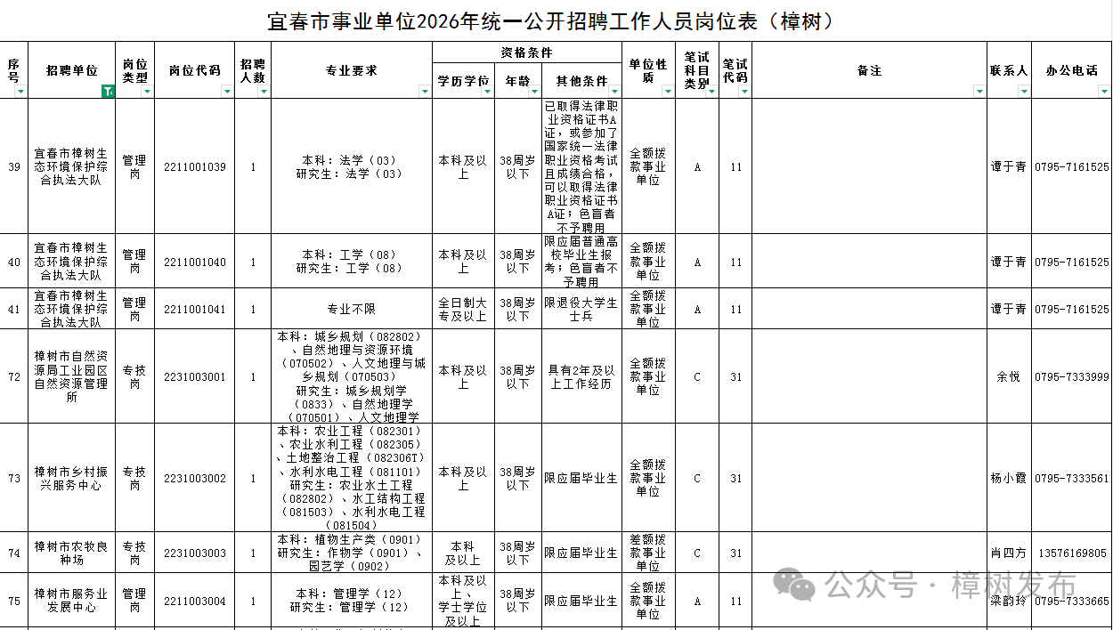 宜春市事業單位2026年統一公開招聘工作人員公告已出,其中樟樹招30人。