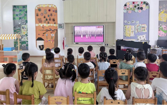活動前,各班教師調試設備,幼兒有序就座;閱兵開始后,孩子們專注緊盯屏幕,受閱方隊的整齊步伐、先進裝備亮相時,現場不時響起驚嘆聲與掌聲。教師用淺顯語言講解:“這是保護國家的軍人叔叔,這些是讓祖國強大的武器”,幫助幼兒理解閱兵意義,孩子們在觀看中初步感知祖國強大,眼神滿是自豪。