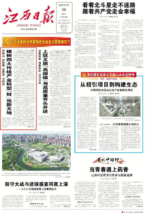 8月25日,江西日報頭版頭條刊發文章《藥轉向 酒轉精 鹽轉深 金轉民,樟樹四大傳統產業轉型“轉”出新天地》,報道我市立足資源稟賦和產業優勢,深入推進“藥轉向、酒轉精、鹽轉深、金轉民”,藥、酒、鹽、金屬家具四大傳統產業轉型跑出“加速度”。