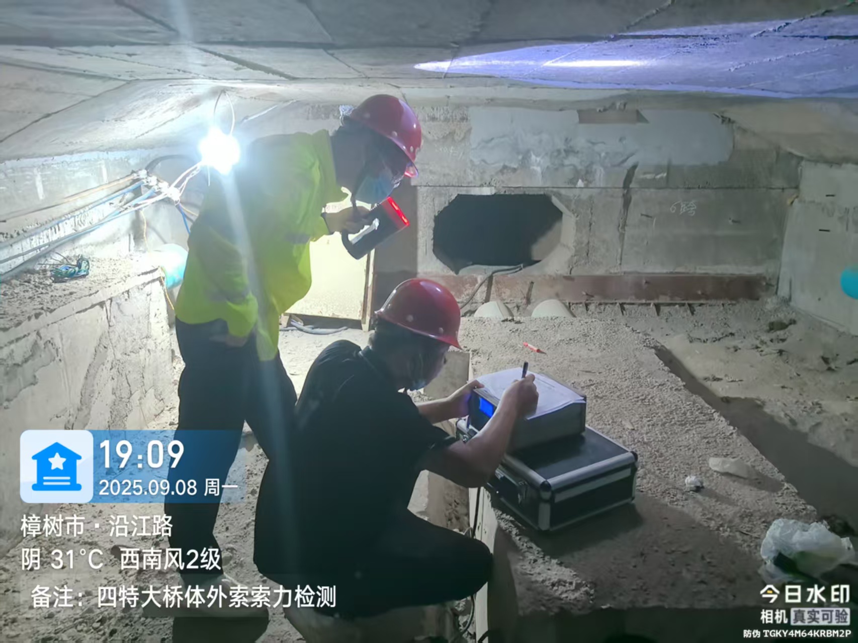 為提高橋梁承載能力、改善結構抗裂和耐久性,樟樹市四特?橋?橋第40跨-45跨共計安裝了 24 根體外索,長期使用后可能因銹蝕、疲勞或預應力損失導致性能下降。為及時掌握體外索技術狀況,保障橋梁安全運營,2025年9月8日-9月12日,樟樹市交通運輸局組織專業技術力量對該體外索進行了索力測量檢測。
