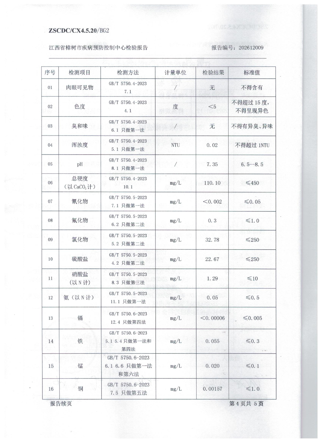 樟樹市供水有限公司2026年第一季度出廠水檢驗報告