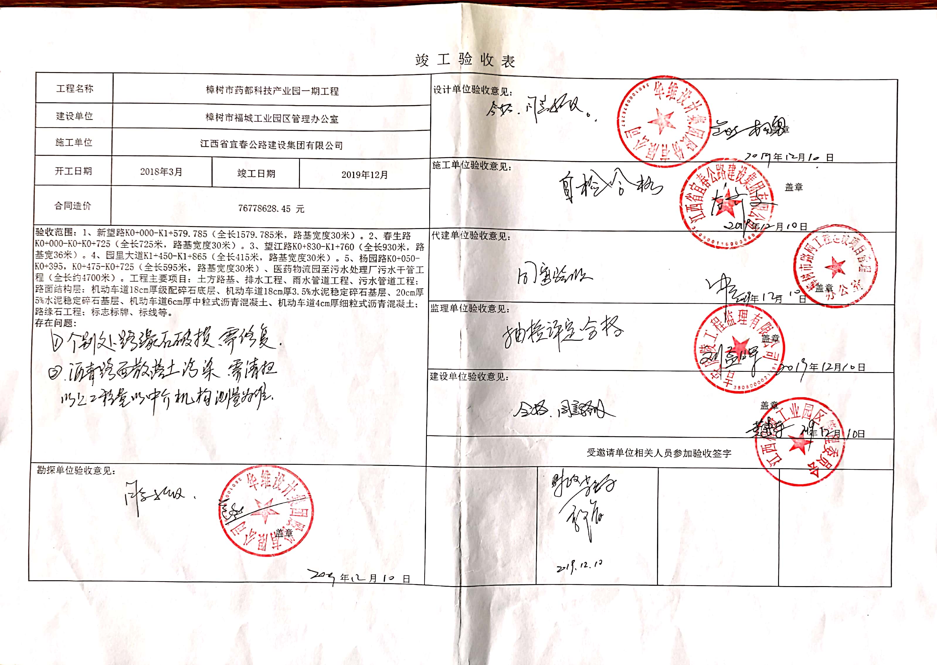 【竣工有關信息】藥都科技產業園項目一期工程竣工驗收表