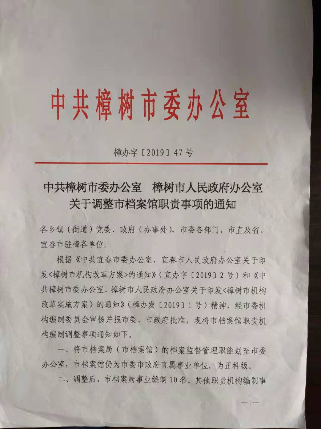關(guān)于調(diào)整市檔案館職責(zé)事項的通知