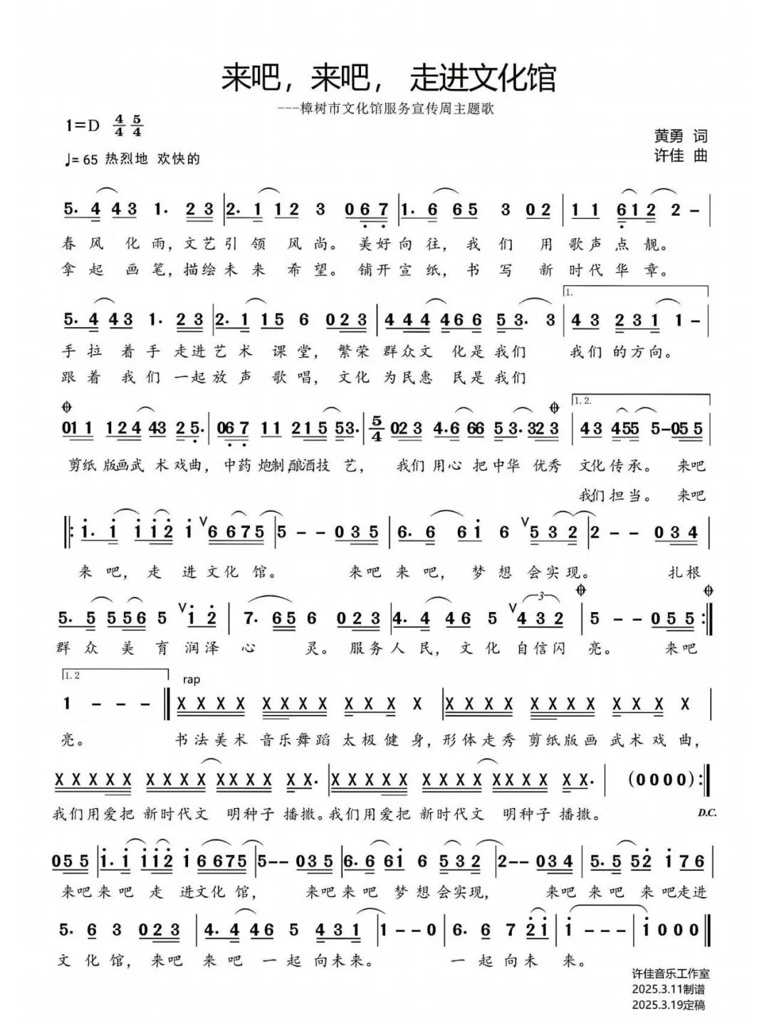 2025樟樹市文化館創(chuàng)作歌曲《來吧來吧,走進文化館》,這首歌是為2025年文化館服務(wù)宣傳周創(chuàng)作的主題歌,詞作者是樟樹市文化館館長黃勇,作為一名基層文化館長,創(chuàng)作這首作品的初衷是讓人們“走進文化館,認識文化館,愛上文化館”,希望通過這首作品,讓更多的群眾了解文化館工作。
