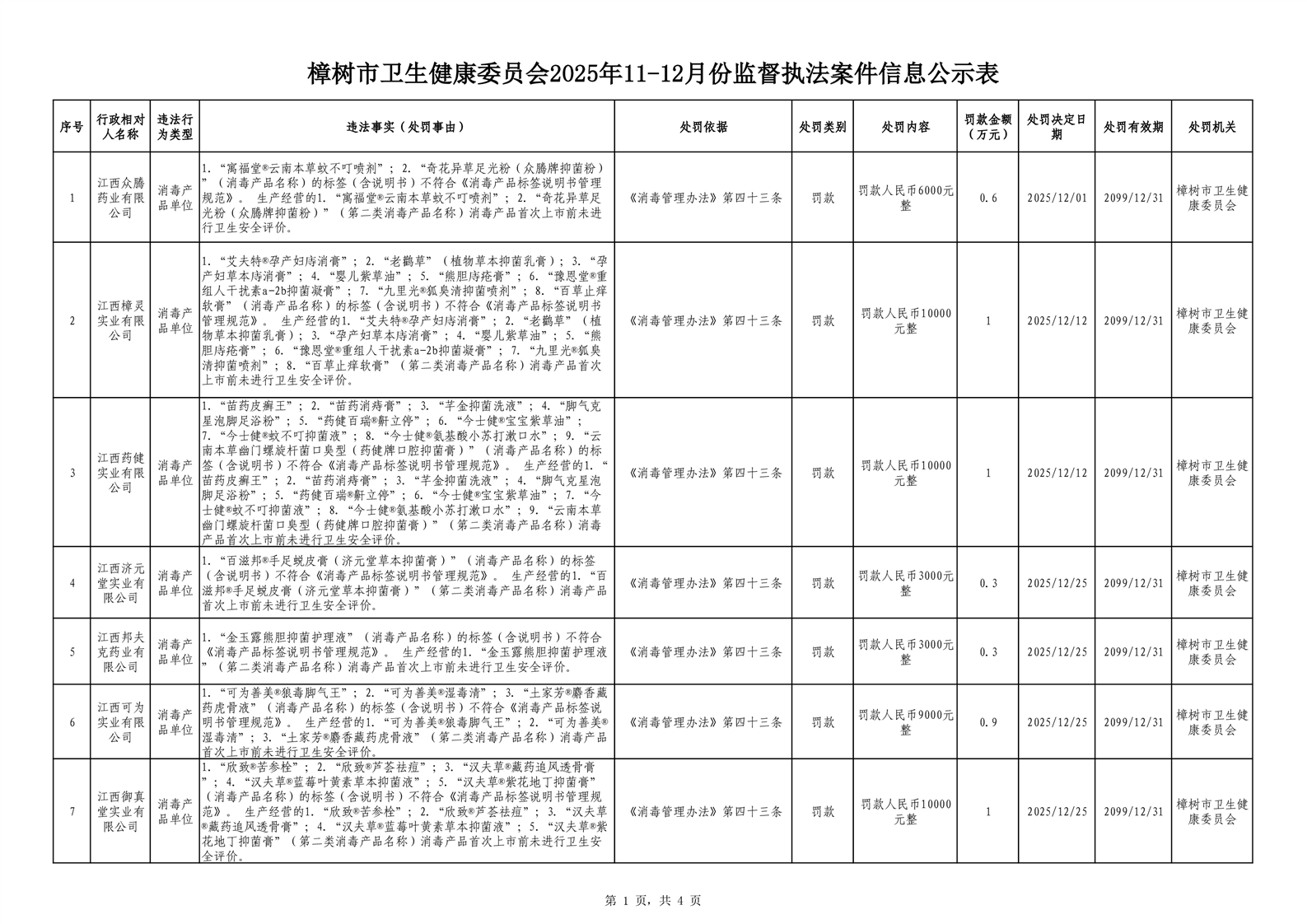 樟樹市衛(wèi)生健康委員會(huì)2025年11-12月份監(jiān)督執(zhí)法案件信息公示表