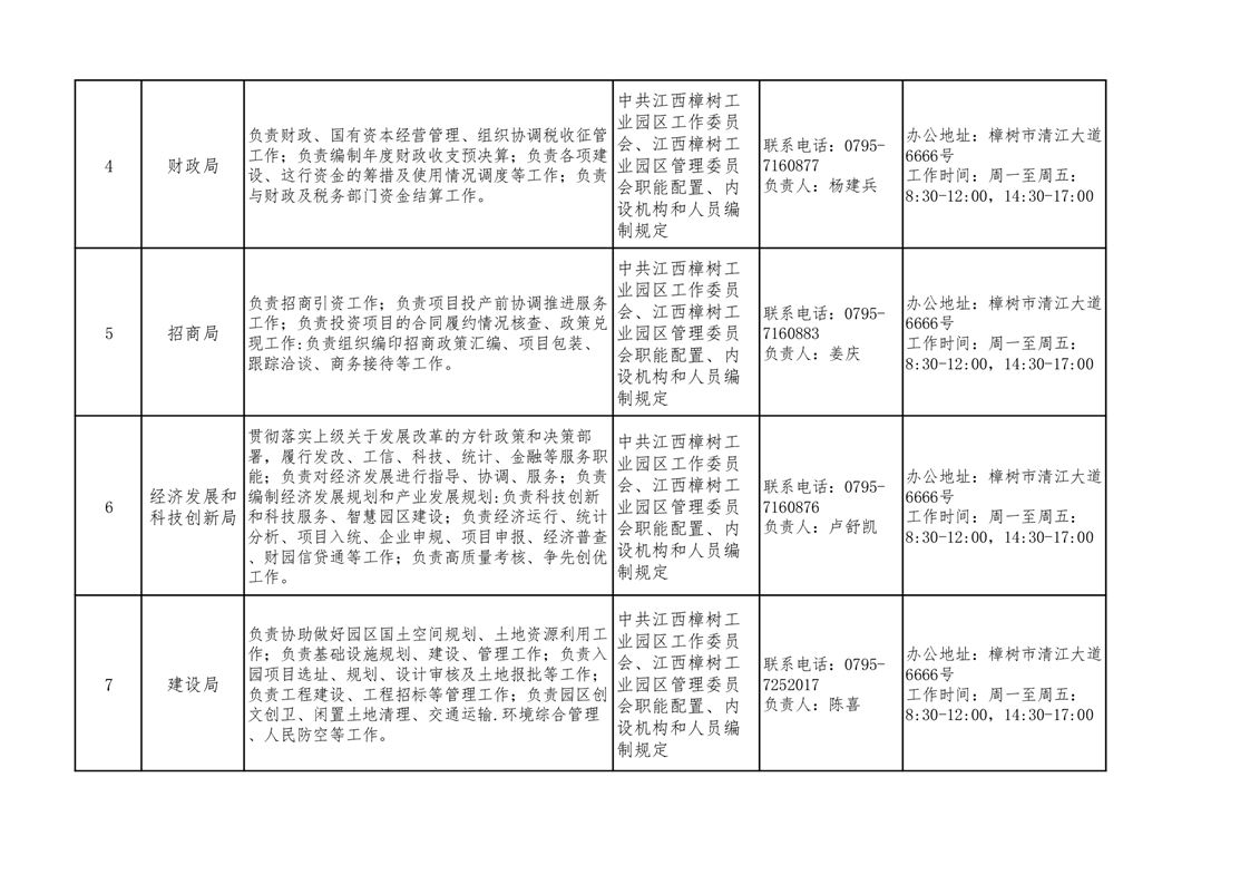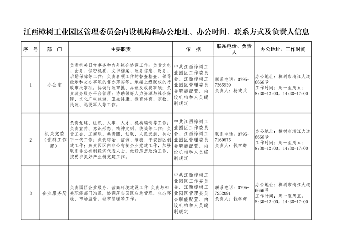 江西樟樹工業園區管理委員會內設機構和辦公地址、辦公時間、聯系方式及負責人信息