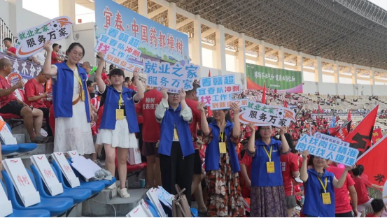 抬眼望去,“就業之家 服務萬家”、“看贛超 宜春隊沖刺 找工作 就到就業之家”的應援牌在球迷方陣中格外醒目!樟樹市就業之家的志愿者們化身最鐵桿粉絲,手舉宣傳板,為心愛的宜春隊吶喊助威,也為每一位尋找機遇的“職場球員”瘋狂打Call!“看球找工作兩不誤,這波應援太到位了!”不少球迷邊拍照邊點贊。贛超熱浪+就業能量,燃爆全場!
