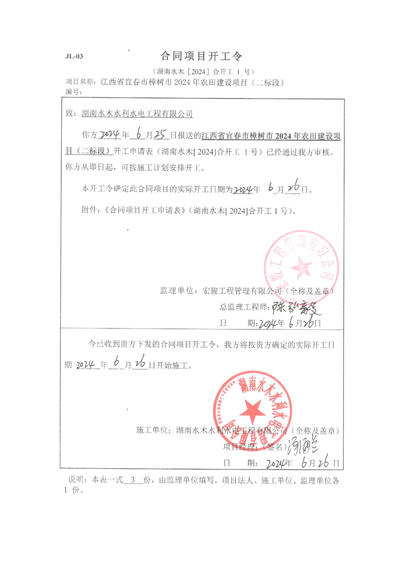 江西省宜春市樟樹市2024年農田建設項目(二標段)合同項目開工令