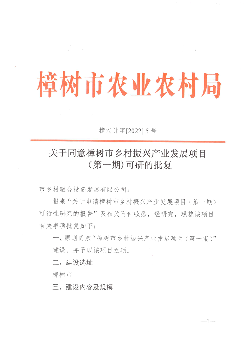 關于同意樟樹市鄉村振興產業發展項目(第一期)可研的批復