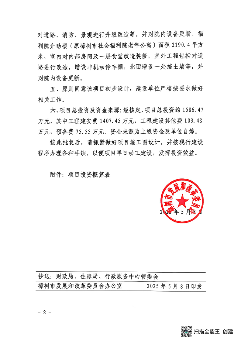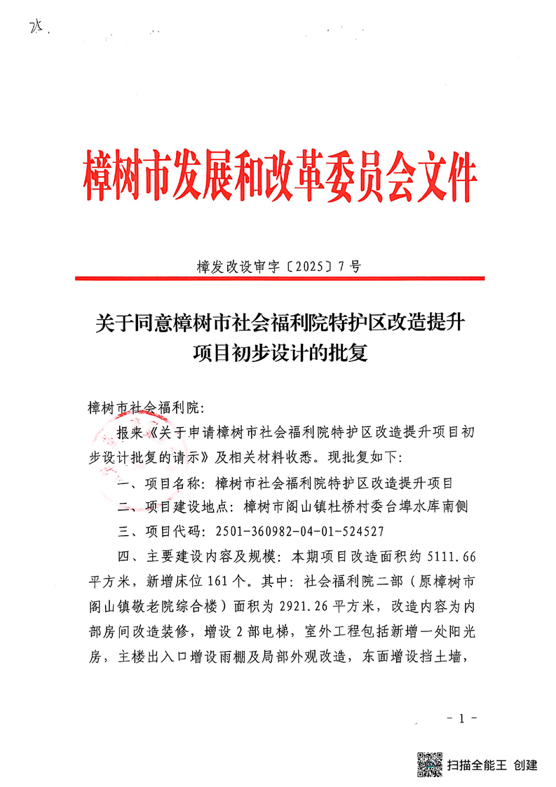 樟發(fā)改社審字〔2025〕7號(hào)關(guān)于同意樟樹市社會(huì)福利院特護(hù)區(qū)改造提升項(xiàng)目初步設(shè)計(jì)的批復(fù)