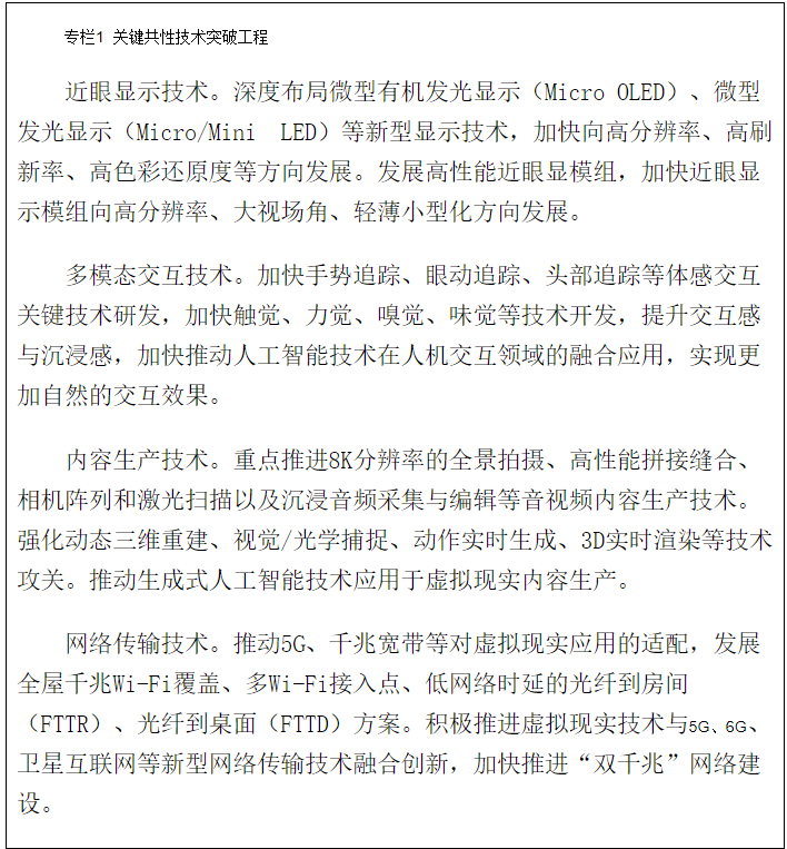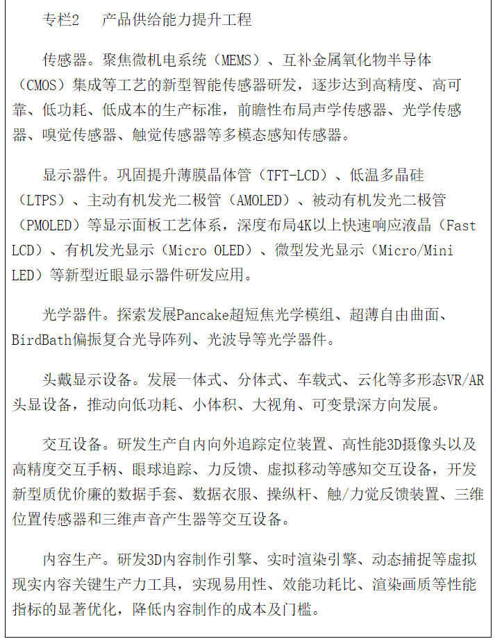 加快核心元器件、終端外設、內容開發工具、業務運營平臺的創新突破。鼓勵開發先進適用的核心元器件,發展新型智能傳感器、多模態感知傳感器、近眼顯示器件、近眼顯示模組等關鍵部件。加快終端設備創新突破,促進一體式、分體式等多樣化終端產品發展,提升規模化量產能力,開發內容生產工具,提高優質內容供給水平。