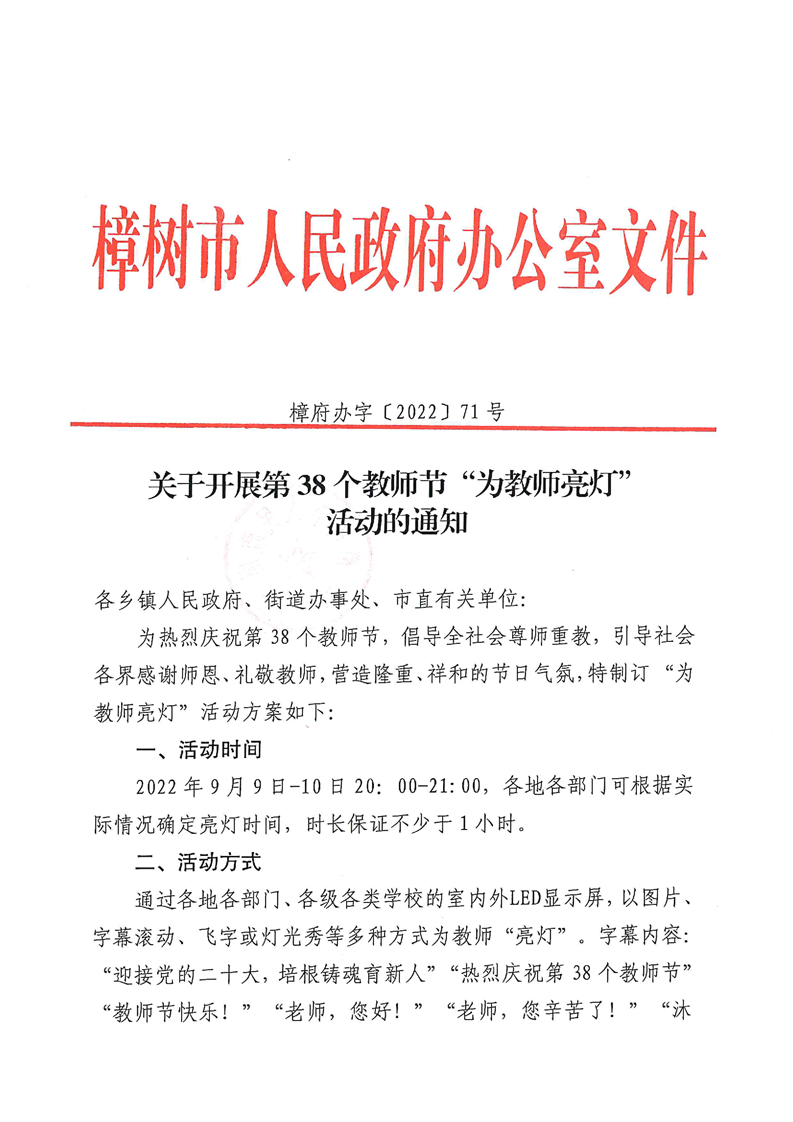 樟府辦字〔2022〕71號關于開展第38個教師節“為教師亮燈”活動的通知