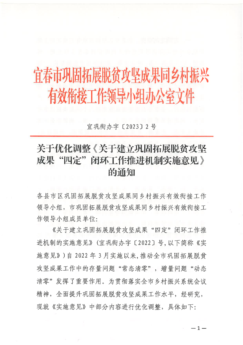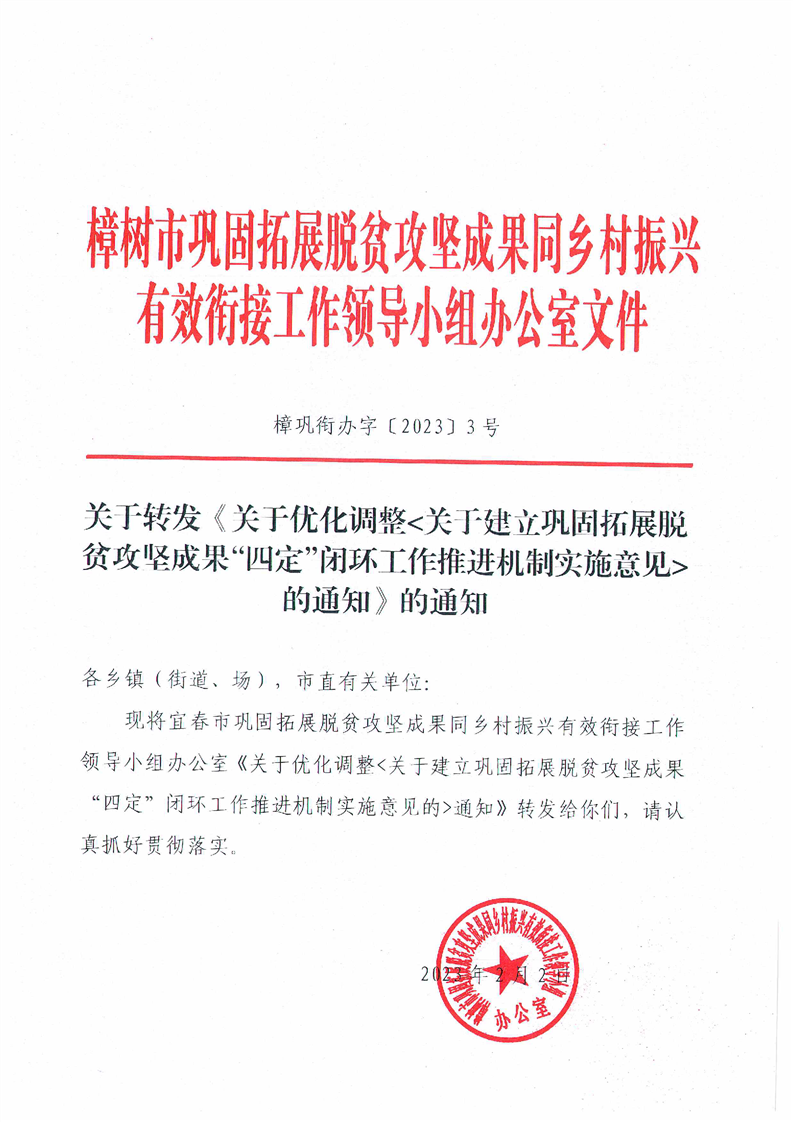 樟鞏銜辦字〔2023〕3 號 關(guān)于轉(zhuǎn)發(fā)《關(guān)于優(yōu)化調(diào)整《關(guān)于建立鞏固拓展脫貧攻堅成果“四定”閉環(huán)工作推進機制實施意見》的通知》的通知
