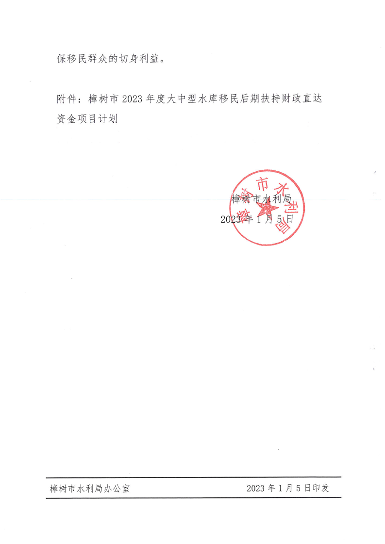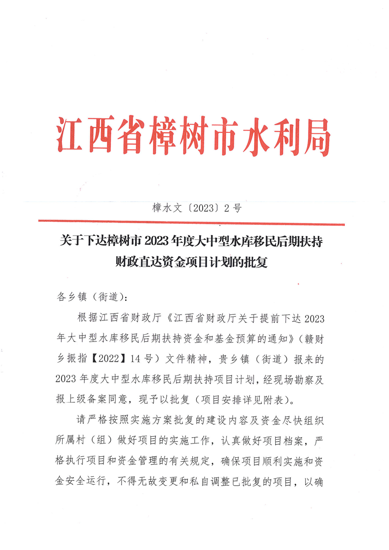 樟水文〔2023〕2號關于下達2023年水庫移民財政直達資金項目計劃的批復