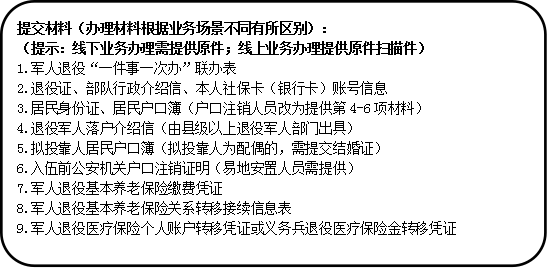 1.軍人退役“一件事一次辦”聯辦表 2.退役證、部隊行政介紹信、本人社保卡(銀行卡)賬號信息 3.居民身份證、居民戶口簿(戶口注銷人員改為提供第4-6項材料) 4.退役軍人落戶介紹信(由縣級以上退役軍人事務部門出具) 5.擬投靠人居民戶口簿(擬投靠人為配偶的,需提交結婚證) 6.入伍前公安機關戶口注銷證明(易地安置人員需提供) 7.軍人退役基本養老保險繳費憑證 8.軍人退役基本養老保險關系轉移接續信息表 9.軍人退役醫療保險個人賬戶轉移憑證或義務兵退役醫療保險金轉移憑證 |