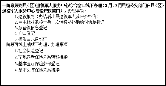 1.退役報到 2.落戶登記(退役軍人恢復戶口) 3.核發居民身份證 4.預備役登記 5.社會保險登記 6.軍地養老保險關系轉移接續 7.基本醫療保險參保登記 8.基本醫療保險關系轉移接續 9.退役士兵自主就業一次性經濟補助金給付 |
