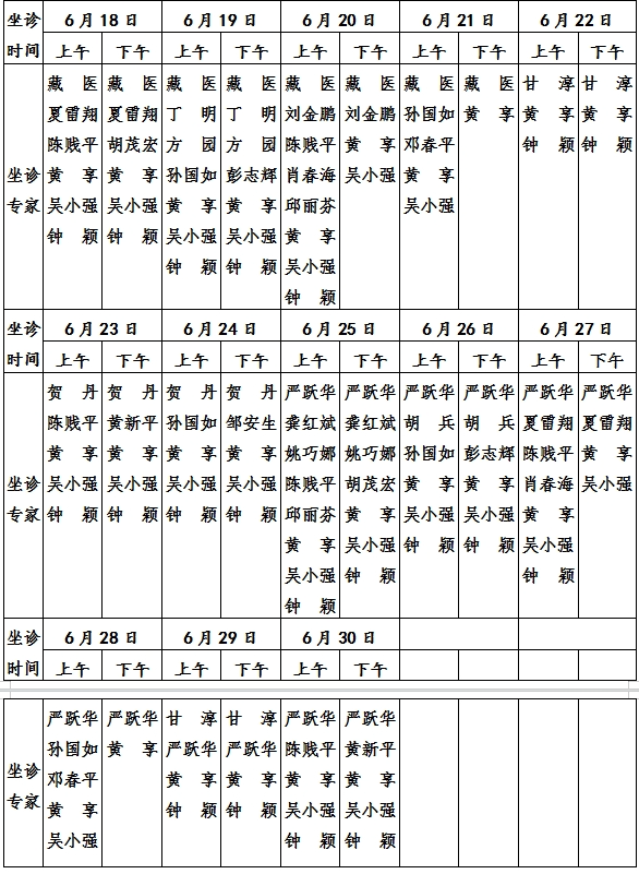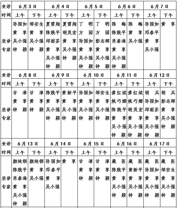 坐診時間:6月4日上午、6月12日上午、6月20日上午、6月25日上午